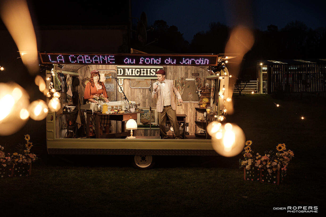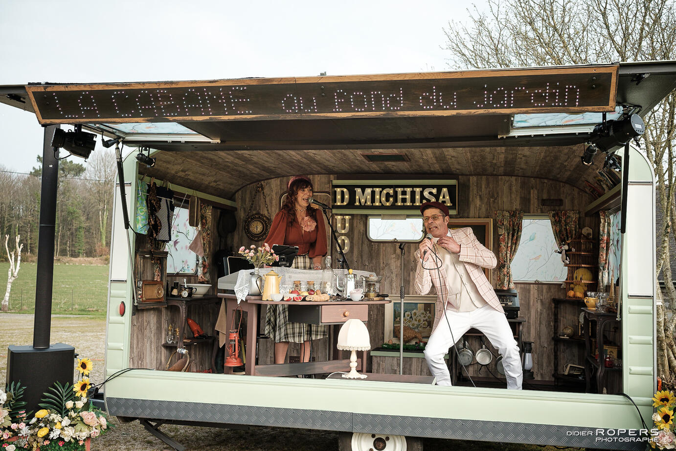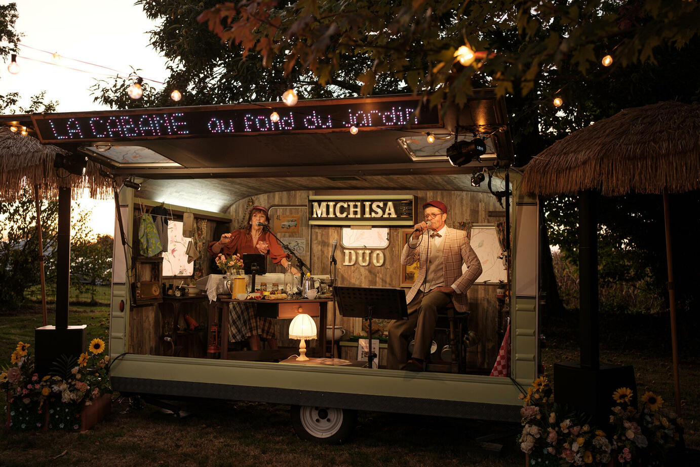 Une simple prise électrique et le Duo Michisa s’occupe de poser sa caravane-scène dans votre jardin, dans votre hangar, sur la place de votre village, sur votre marché, devant votre société... pour un concert de chansons sorties dans les 3 décennies 50's, 60's et 70's.
